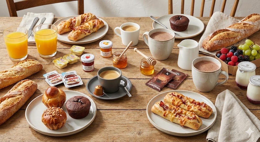 2 jus d’orange, 4 beurres individuels, 2 portions de Nutella, 2 confitures, 2 miels, 2 capsules de café, 2 sachets de chocolat chaud, lait, ainsi qu’une sélection de produits de boulangerie : 2 baguettes, 2 moelleux au chocolat, 1 mini brioche pralinée, 1 mini brioche feuilletée, 2 ficelles lardons-fromage, et 2 yaourts ou une barquette de fruits*